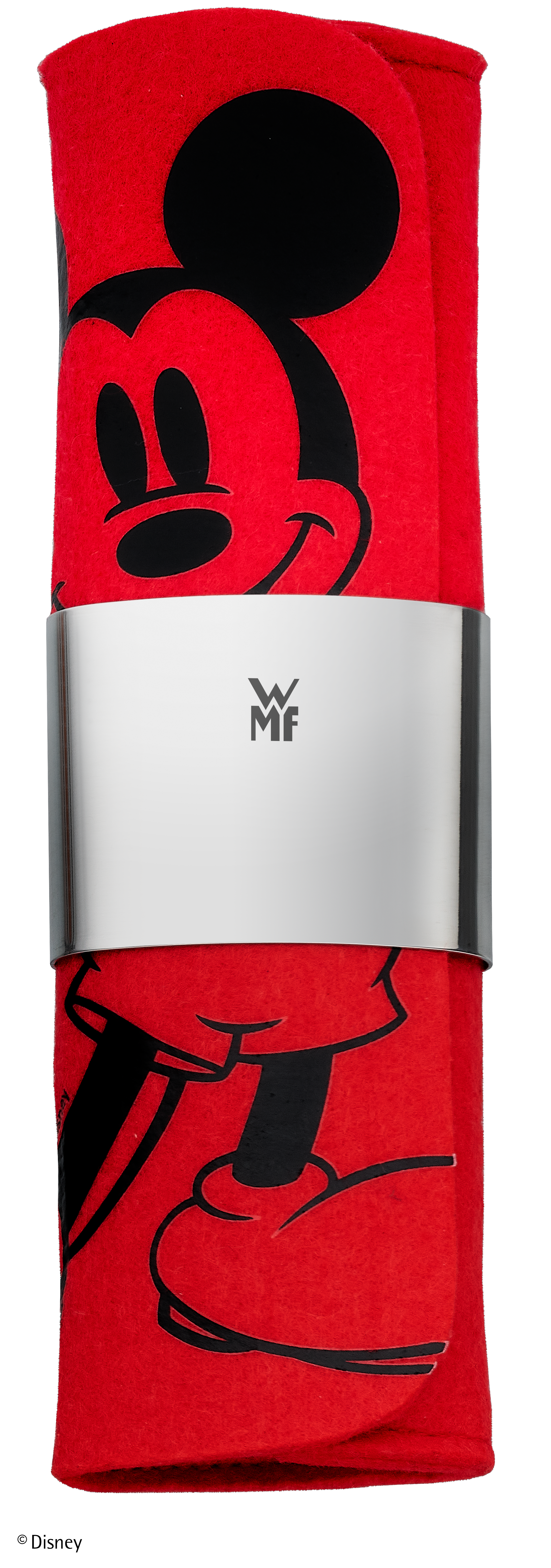 The kids’ cutlery fits easily into a bag thanks to its practical case, which has a fixed slot for each item to prevent slipping or rattling. The case is made of 100% recycled material (PES) and is machine-washable for repeated use. And due to its red felt-look finish with Mickey Mouse motif, the case not only fits in perfectly with the cutlery set, but also blends in with the existing product family. The stainless-steel clip that closes the case can be individually engraved, too –just like all the other cutlery items.